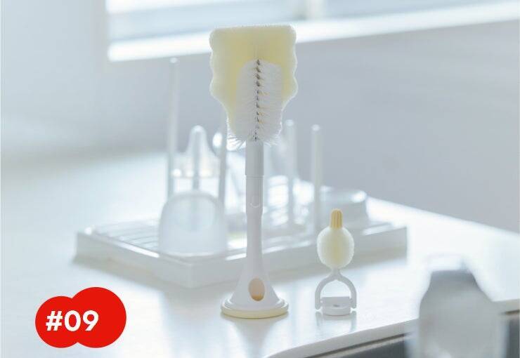ー広口ほ乳びんのための取り替えができるほ乳びん洗いーほ乳びんはボトル部分の口が直径約3 センチほどのスリムタイプが一般的だったところ、ここ数年は直径4.5センチ程度の広口タイプが主流となっている。わずかな違いで粉ミルクやお湯を入れやすく、何より洗いやすいのが支持されている理由。