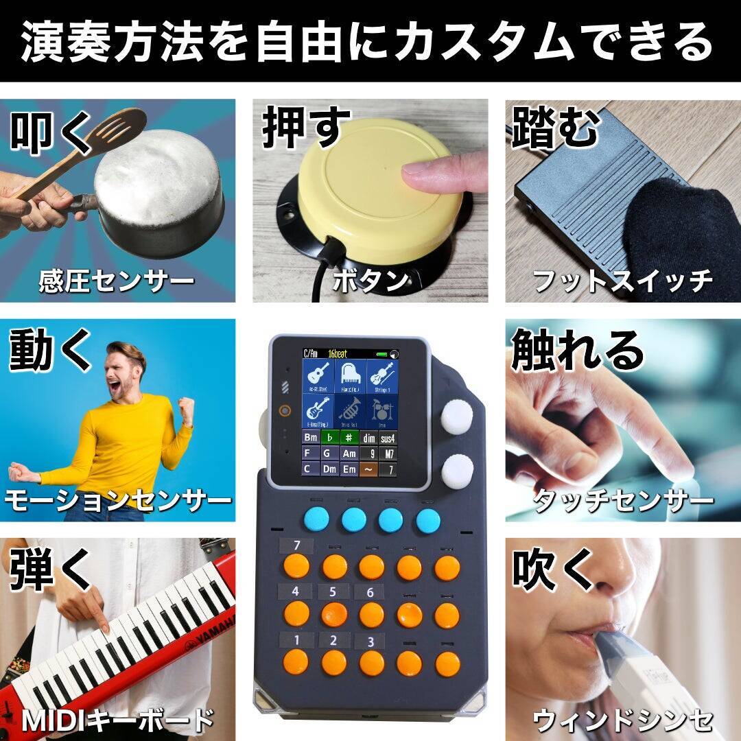 携帯ゲーム機のような本体には様々なコントローラーを接続できます。補助スイッチ、タッチセンサー、視線入力機器、モーションセンサーなどのインターフェイスを接続すれば自由なスタイルで演奏できるため、ユーザー1人ひとりの特性に合わせた楽器を作ることができるのです。