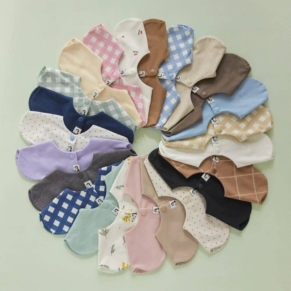 つけ襟風デザインとパイピングの配色がおしゃれで人気急上昇中のパインピングスタイ。5色の新色が登場し、いつものお洋服も秋らしさたっぷりのおしゃれコーデへ。