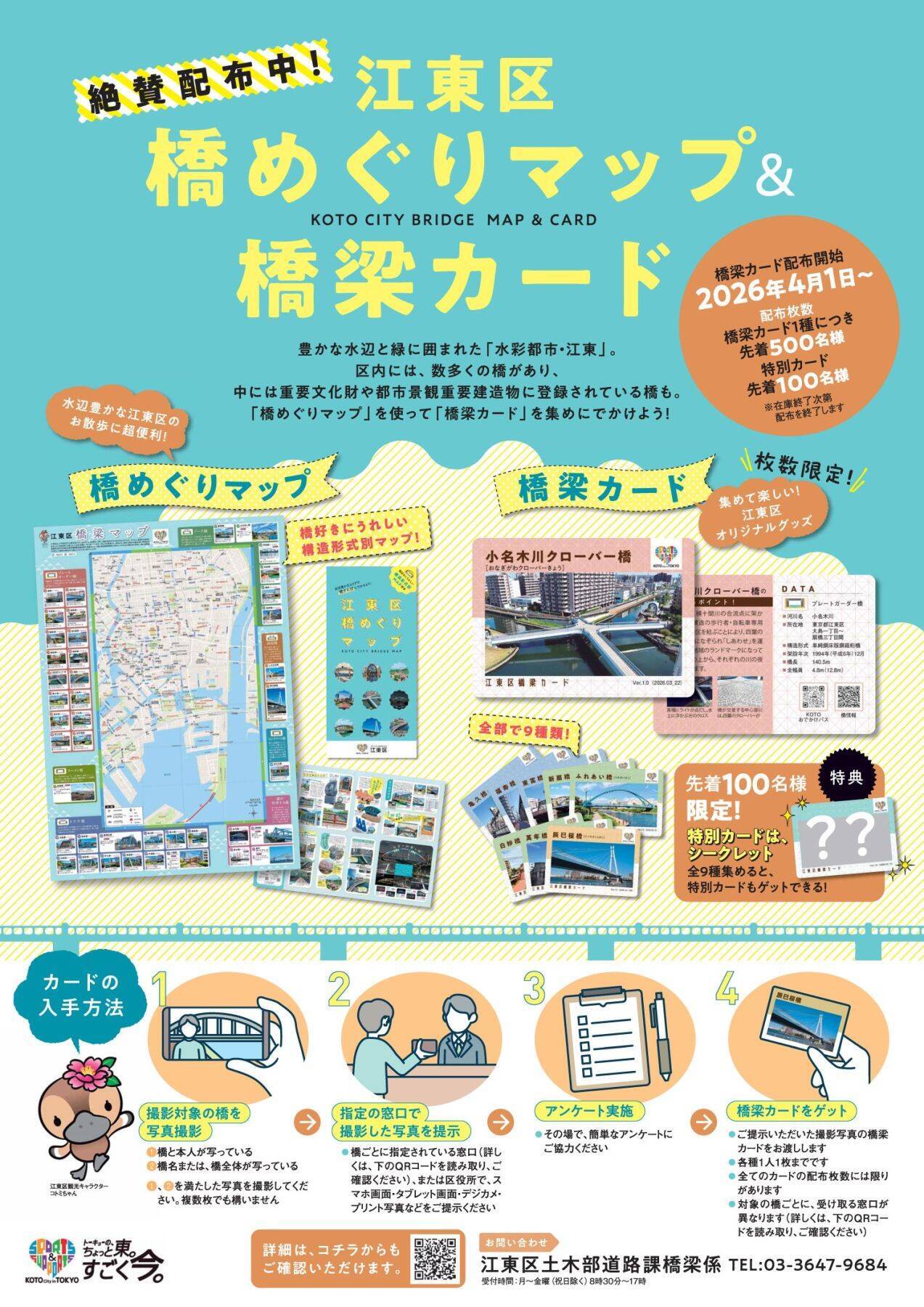 ※1 こうした形で全9枚の橋梁カードを集めて窓口に持参すると、先着100名様まで特別カード(シークレット)がGETできるキャンペーンについて、4月3日に配布終了となりましたが、このたび再開が決定、4月13日(月)より再配布いたします。在庫がなくなり次第終了となりますので、最新情報は江東区のお知らせページにてご確認ください。
