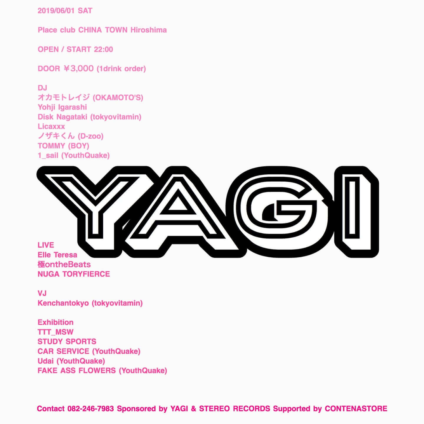 そして今回の広島開催では、レコードレーベルも持つ広島発のアナログレコードショップ・STEREO RECORDSとの共同開催となっており、サポートとして昨年、東京初進出を果たした国内3店舗(東京・大阪・広島)を構える業界大注目のセレクトショップ・CONTENASTOREも参加する。 広島初上陸となる<YAGI>のクリエイティビティ溢れる一夜は見逃せない。EVENT INFORMATION