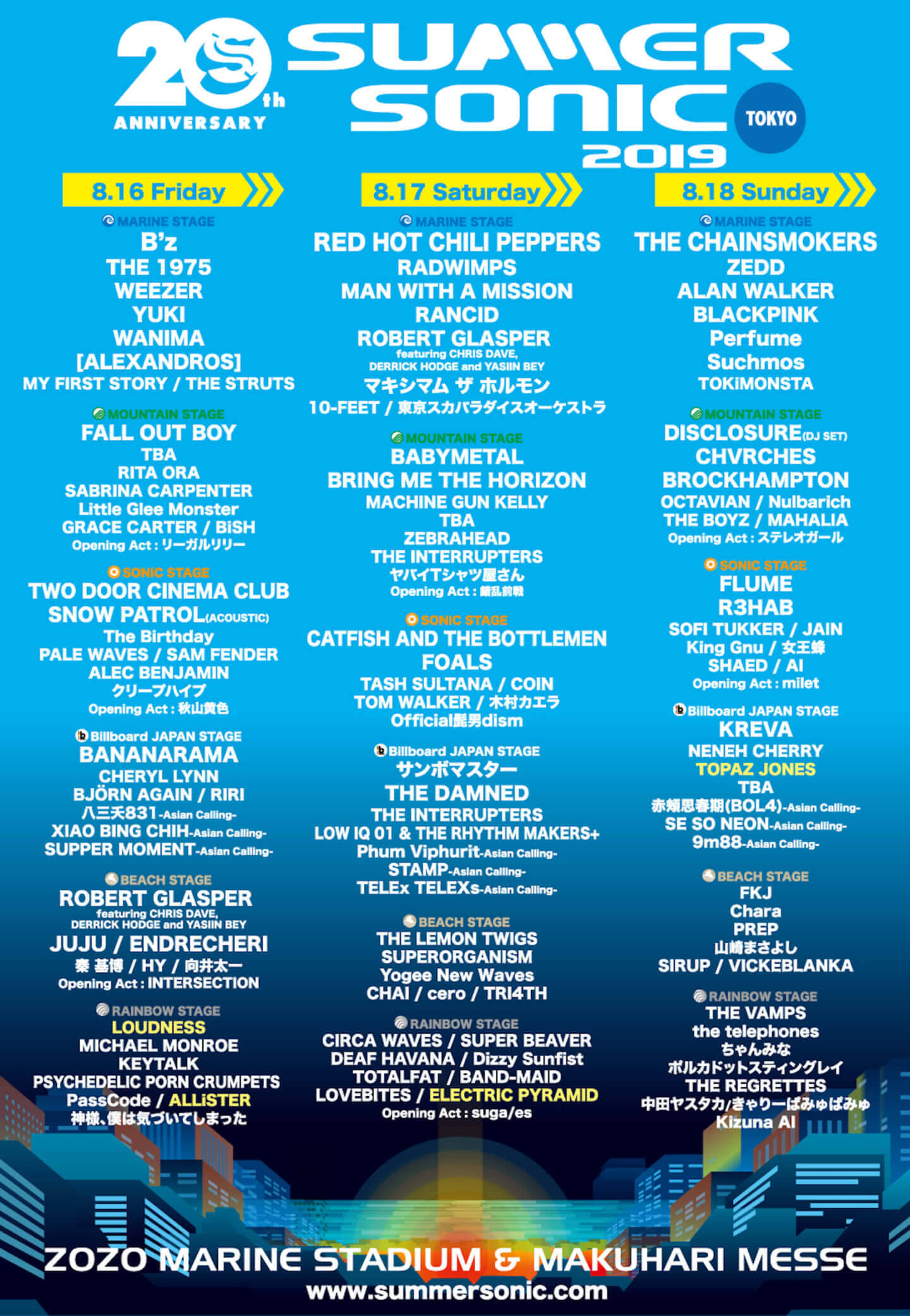 20周年にふさわしい豪華かつバラエティに富んだサマソニらしいアーティスト達の出演ステージが明らかに。気になるアーティストをチェックして8月の本番に備えましょう!また追加アクトとして、日本のメタルシーンの王者LOUDNESSが東阪ともに決定! サマソニ東京には、ファンクをベースにした気鋭のヒップホップアーティスト、トーパス・ジョーンズ、デビュー20周年を迎えたパンクバンド・ALLiSTER、オルタナティブ・ロック・バンド、エレクトリック・ピラミッドが追加に!サマソニ大阪には、昨年新作をリリースしたサイケデリック・ポップ・デュオMGMTが急遽決定。大阪出身のレゲエアーティスト・RED SPIDER、小籔千豊率いる超個性的バンド、ジェニーハイの出演も決定しています。B’z message for SUMMER SONIC 2019