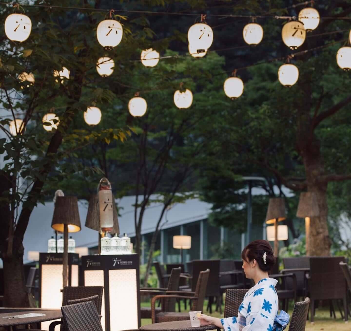 ミッドタウン・ガーデンの芝生に “畳”をモチーフにデザインされた空間が初登場。天井に吊られている傘の内側は、「浮世絵」から着想を得た移りゆく空の色を表現したグラデーションとなり、涼しげな空間が演出される。 夏の夜空の下、畳の上に寝そべりながらゆったりとした時間を過ごせる。「ROKU MIDPARK LOUNGE」