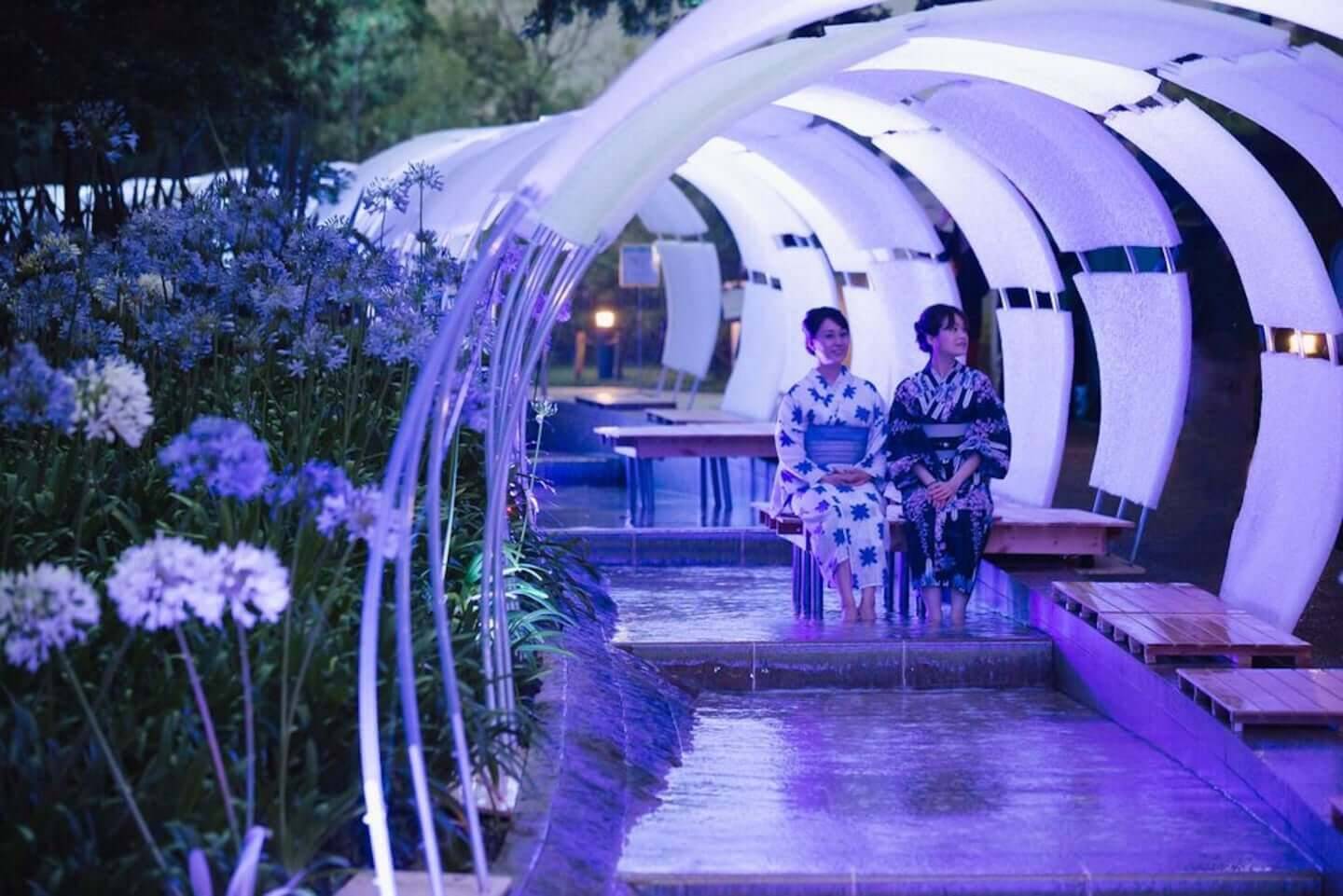 芝生広場には、メインイベントとなる「水と生きる SUNTORY 光と霧のデジタルアート庭園」が登場。夜には庭園内に点在する石を中心に、花火や砂紋をイメージした色とりどりの光が放たれ、ひんやりとした霧に包まれた幻想的な空間を体感できる。制作と演出はエクスペリエンスマーケティングカンパニー「博展」と、ビジュアルデザインスタジオ 「WOW」が手がける。「ASHIMIZU presented by 伊右衛門」