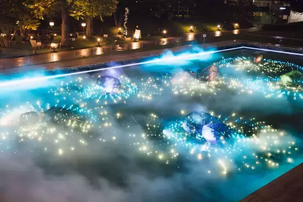 芝生広場には、メインイベントとなる「水と生きる SUNTORY 光と霧のデジタルアート庭園」が登場。夜には庭園内に点在する石を中心に、花火や砂紋をイメージした色とりどりの光が放たれ、ひんやりとした霧に包まれた幻想的な空間を体感できる。制作と演出はエクスペリエンスマーケティングカンパニー「博展」と、ビジュアルデザインスタジオ 「WOW」が手がける。「ASHIMIZU presented by 伊右衛門」