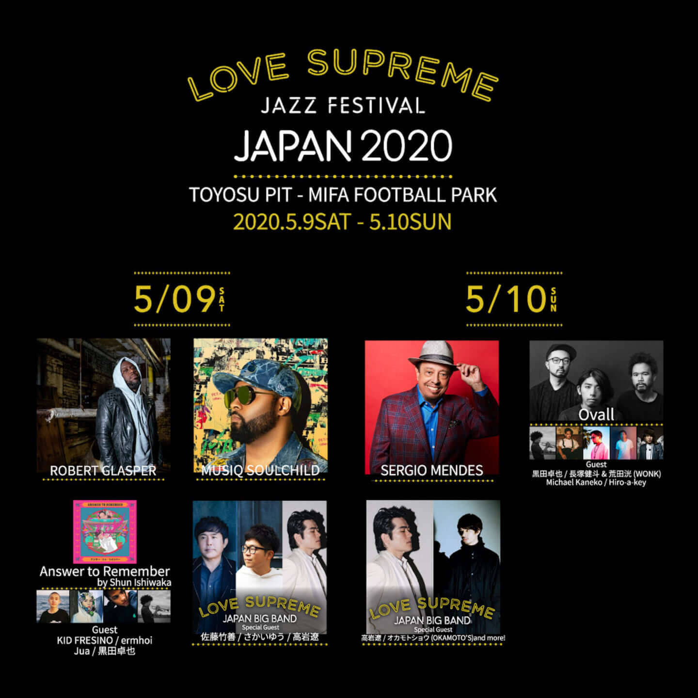 2020年5月9日(土)、5月10日(日)OPEN 13:00 / START 14:00一般チケット1日券:¥11,000(tax incl.)学割チケット1日券:¥6,000(tax incl.)一般チケット2日通し券:¥20,000(tax incl.)VIPチケット2日通し券:¥35,000(tax incl.)※入場時、別途1ドリンク代¥500(各日)※一般チケット、学割チケットはオールスタンディング※学割チケットは、限定枚数にて高校生・大学生のみ購入可能※中学生以下に関しては、保護者同伴に限り入場無料※VIPチケットは、PIT内後方に指定席あり、MIFA内に特別エリアあり※VIPチケットは、2日通し券としてのみの販売※一般発売日:3月28日(土)10:00豊洲PIT・MIFA Football ParkLINE UP:ROBERT GLASPER and more!!※メンバー編成、出演日は追ってお知らせします※一般発売日:3月上旬予定LINE UP:5月9日(土)ROBERT GLASPER、MUSIQ SOULCHILD、Answer to Remember by Shun Ishiwaka (Guest:KID FRESINO / ermhoi / Jua / 黒田卓也)、LOVE SUPREME JAPAN BIG BAND - Special Guest:佐藤竹善 / さかいゆう / 高岩遼5月10日(日)SERGIO MENDES、Ovall(Guest:黒田卓也 / 長塚健斗&荒田洸 (WONK) / Michael Kaneko / Hiro-a-key)、LOVE SUPREME JAPAN BIG BAND - Special Guest : 高岩遼 / オカモトショウ(OKAMOTO’S)主催・企画制作:LOVE SUPREME JAZZ FESTIVAL JAPAN 2020実行委員会問い合わせ:キョードー東京 0570-550-799※平日:11時~18時 土日祝:10時~18時