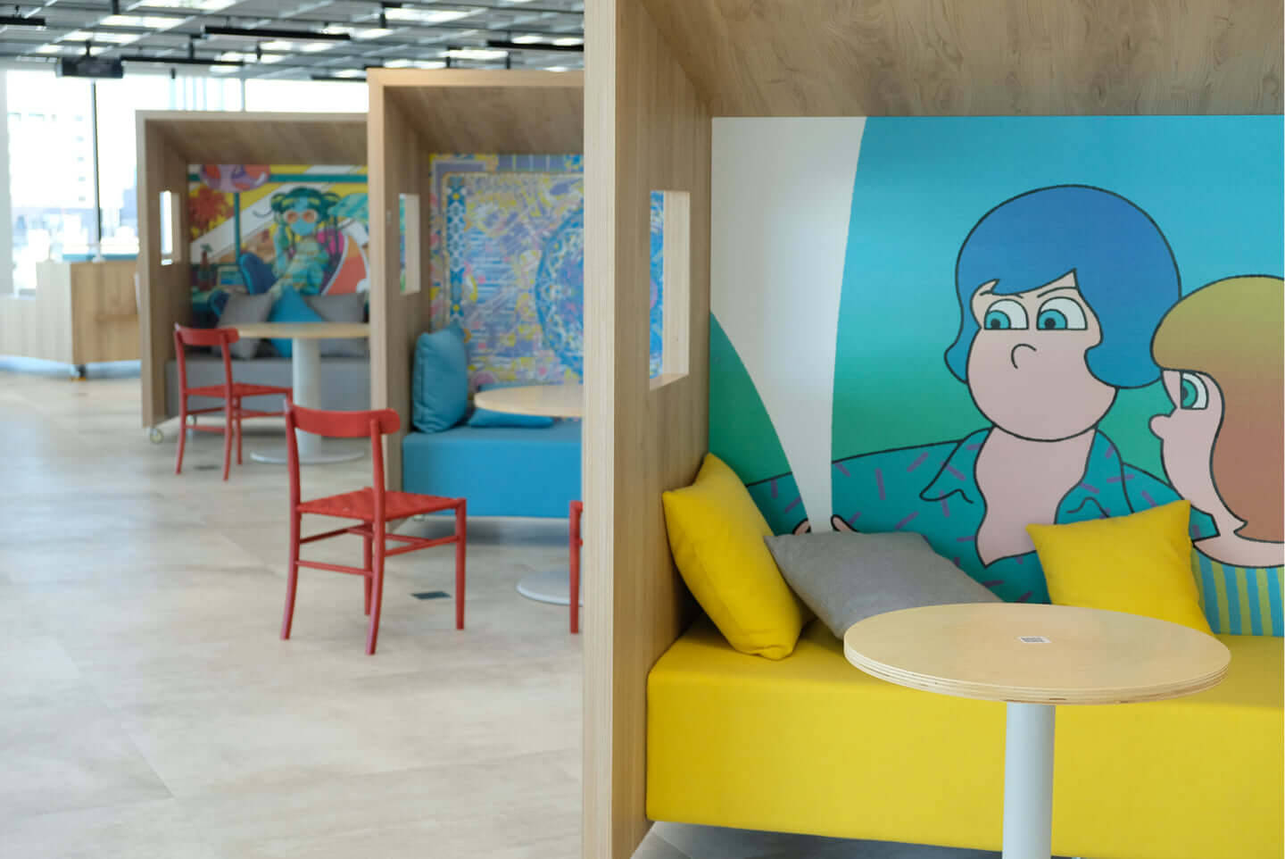 オリジナルで制作された木製ブースの内側を色彩豊かに飾るのは、気鋭のイラストレーター・デザイナーによるウォールプリント。JUN OSON、GraphersRock、Utomaru、WALNUTがユニークな感性を表現してくれました。