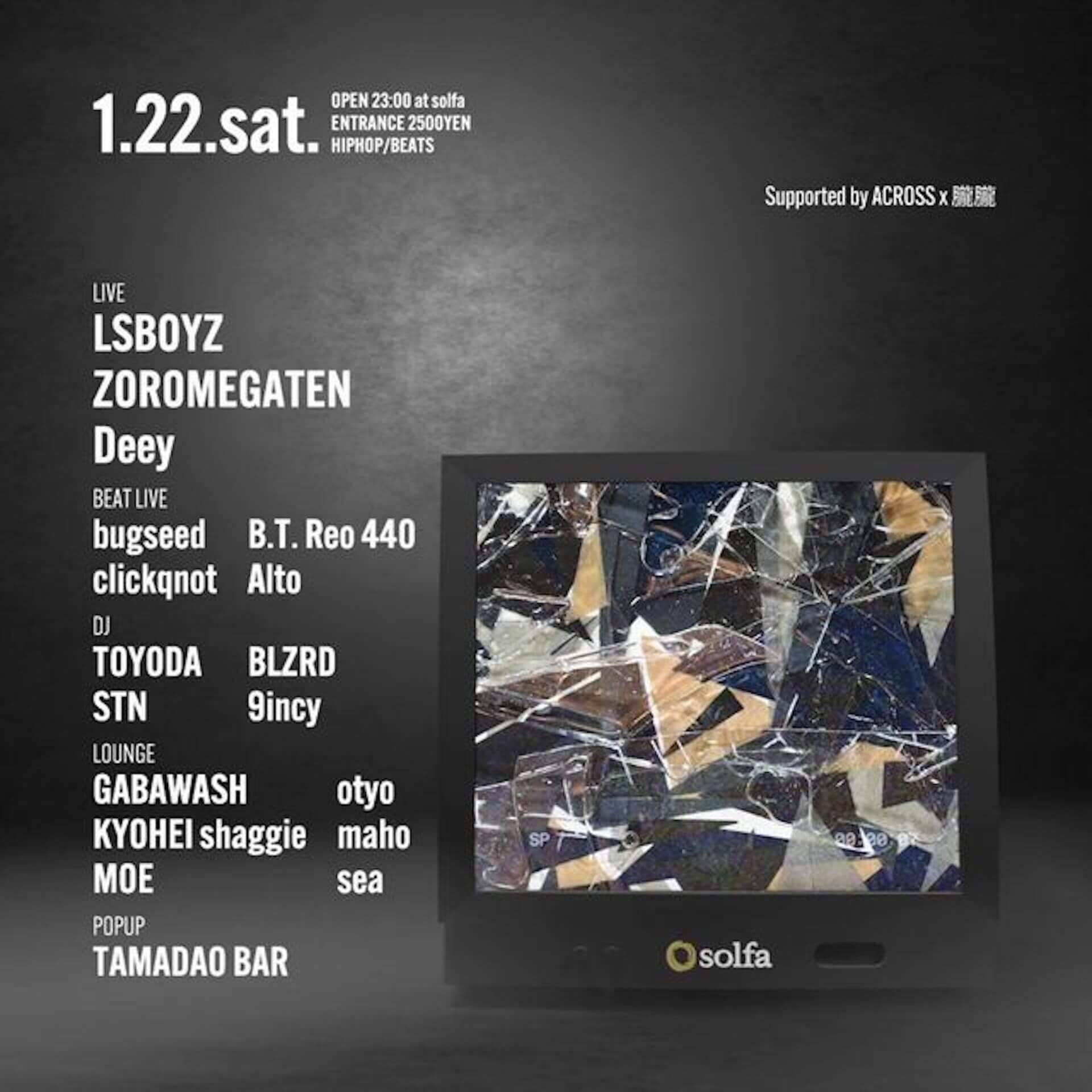 1月22日(土)にはAlto主催<ACROSS>とDJ sea主催<朧朧>のコラボイベントが開催。MIKIとのジョイントEP『Jade』をリリースしたばかりのLSBOYZに加え、人化イルミネーションのZOROMEGATEN、沖縄のクルーKICKIN ENISHI'S所属・Deeyがライブ、BugseedやB.T. Reo 440、clickqnot、Altoがビート・ライブを披露。TOYODA、BLZRD、STN、9incyらがDJとして登場する。