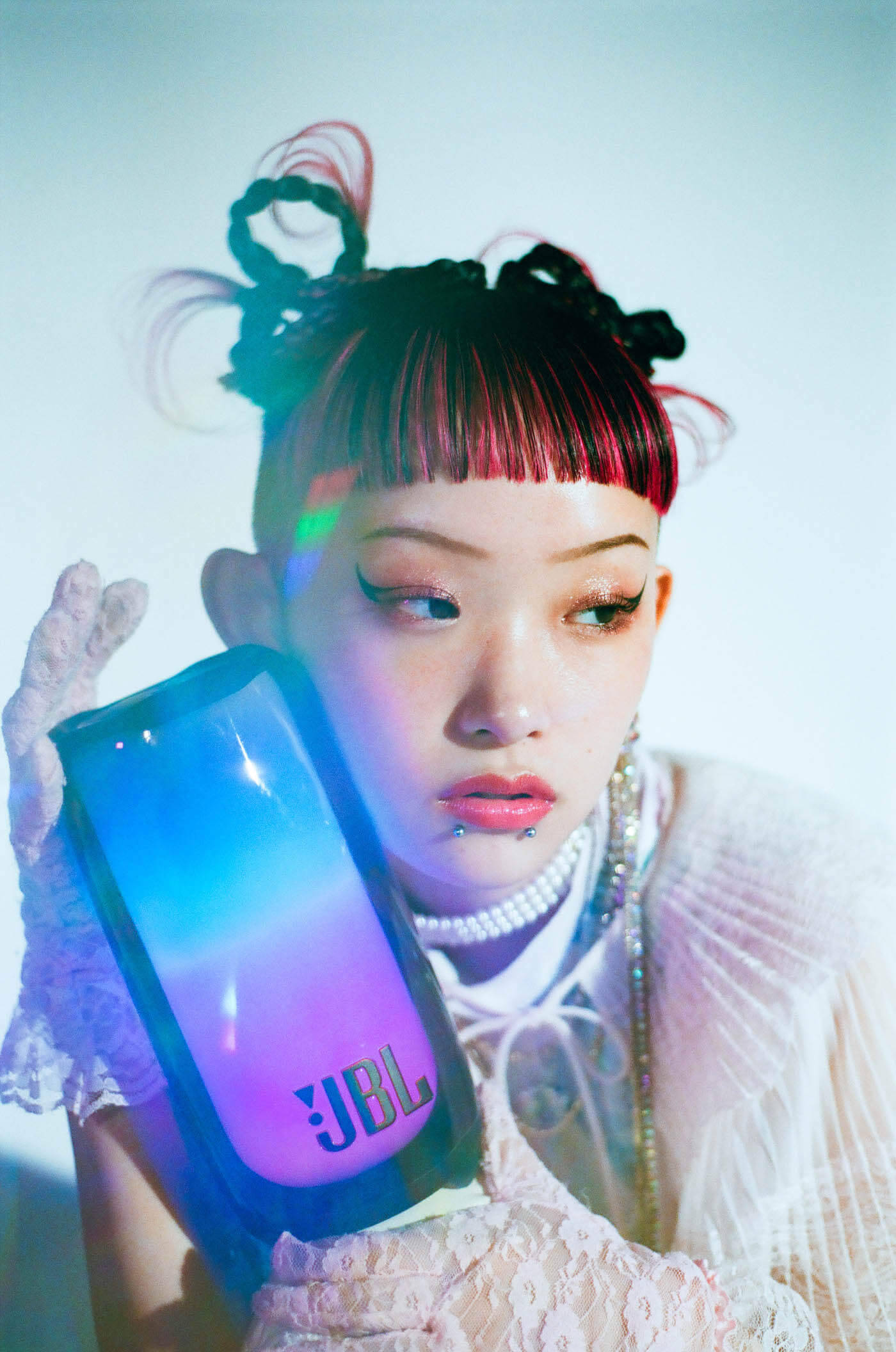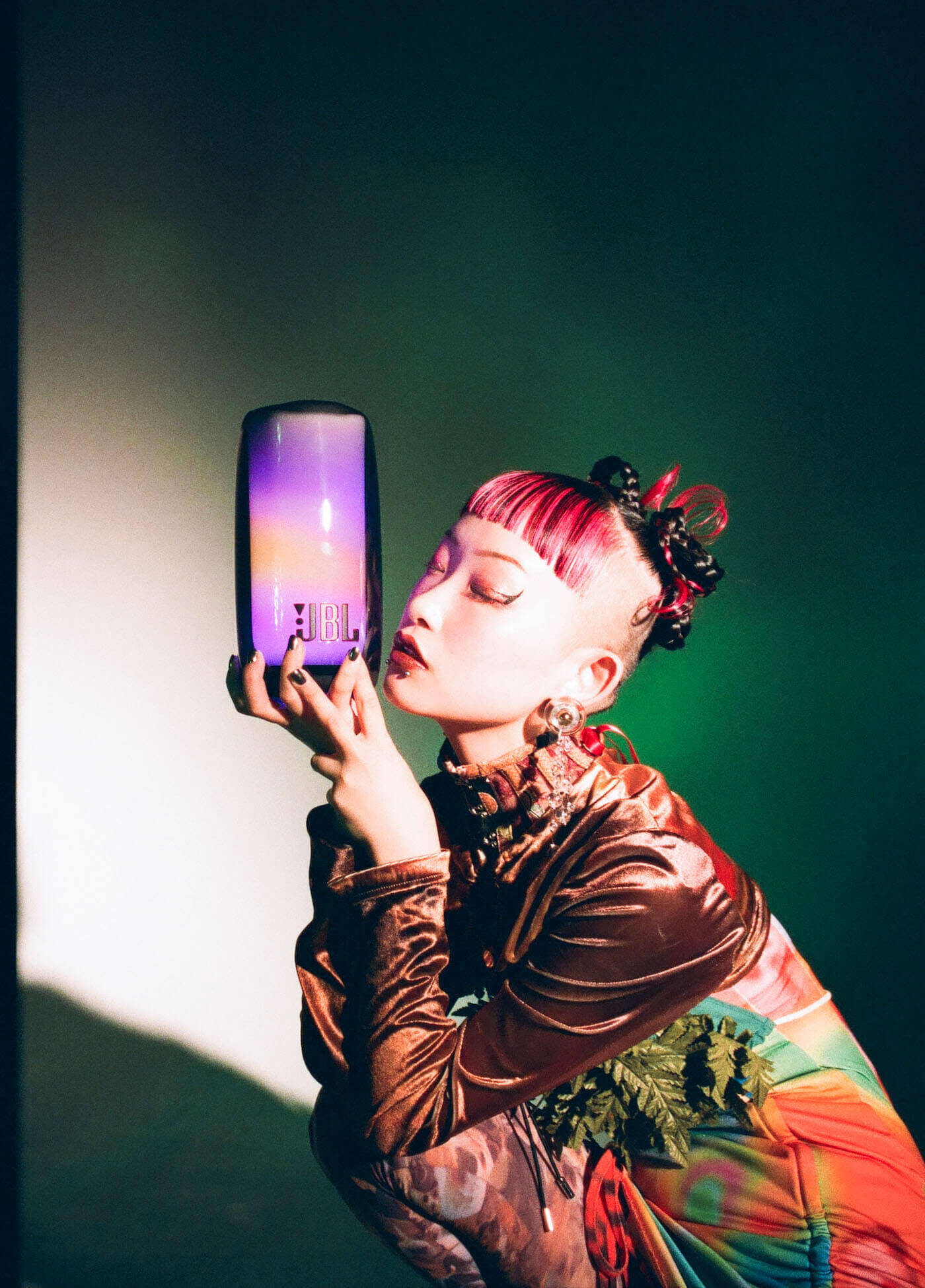 今回は特別企画として、新鋭フォトグラファー・Kana Tarumiとタッグを組み、オリジナルのルックを撮影。「JBL PULSE 5」の特徴でもある色鮮やかなライティングが、「光」と「色」を演出し、幻想的な写真に仕上がった。