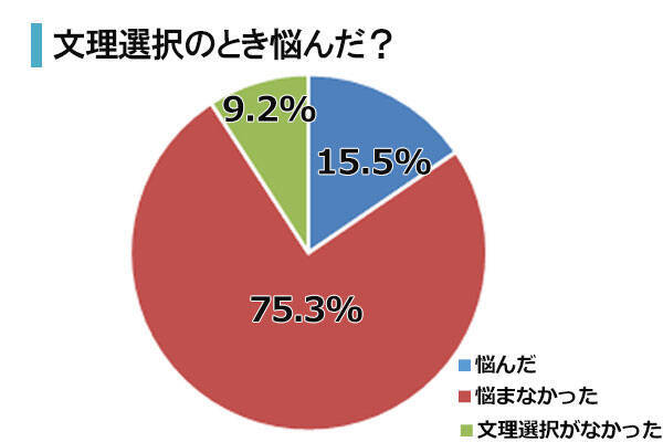 高校2年生のときの文理選択に悩んだ…15.5%、悩まなかった…75.3%、文理選択はなかった…9.2%と、悩んだ人が少なかったものの、