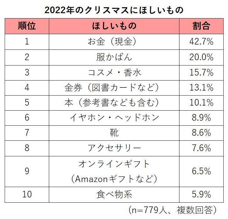 昨年の「2021年の今、欲しいクリスマスプレゼントランキング」に引き続き、「今年のクリスマスにほしいプレゼント」を高校生779人に聞いてみたよ。