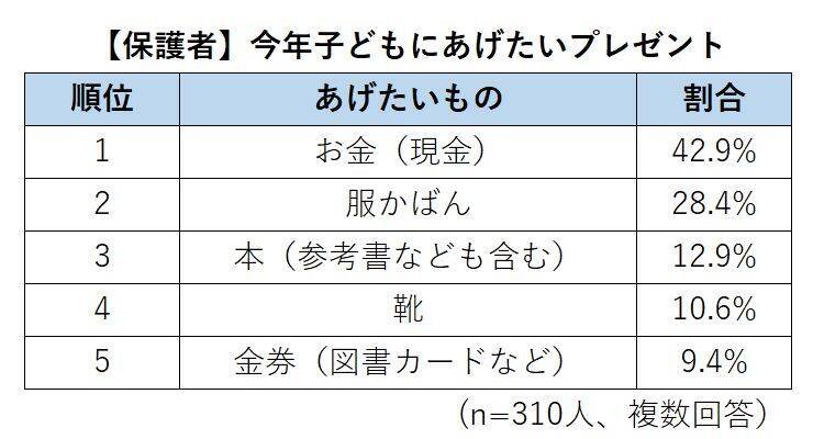 2位の「現金」を始めとするお金系のプレゼントでは、好きなものを自分で選んで買えるのはもちろん、マネー教育の一環としてあえてこの形を選んでいる様子も。
