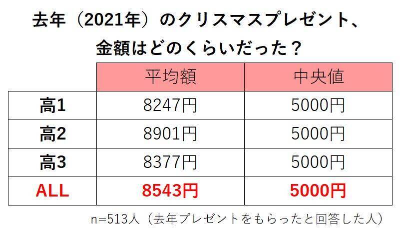2021年12月にクリスマスプレゼントをもらったと答えた高校生513人にもらったプレゼントの金額をリサーチ!