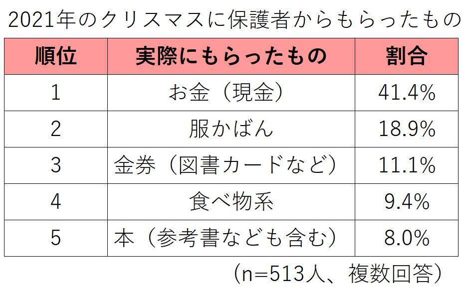 続いては2021年にクリスマスプレゼントをもらった高校生513人を対象に、「実際に保護者からもらったもの」を複数回答可で聞いてみたよ!