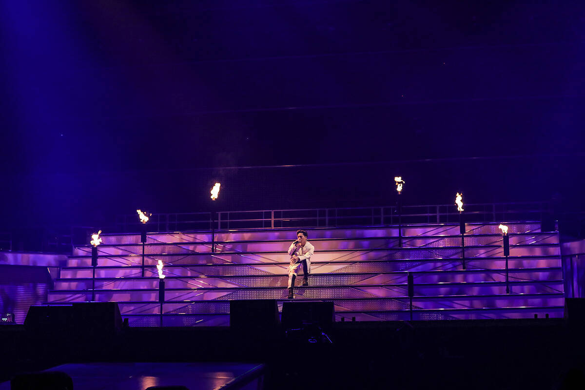 「WASTED LOVE」「LUXE」と続き、インタールードの後はフードを被ったダンサー達を従え、青い炎が上がる中で披露されたトロピカル・ハウス「BLUE SAPPHIRE」。華やかなサウンドとミステリアスな雰囲気を放つ登坂。そのギャップが印象的だ。MCであまり多くを語らない登坂だが、ステージの演出やインタールードで流れる映像を含め、ライブのクリエイティブには自身のこだわりを存分に発揮。オーディエンスと同じ目線に立って楽しく「対話」していくというより、自身の創作物をストイックに突き詰める「孤高さ」が、彼のソロライブの特徴でもある。その妥協なき姿勢は、前回のツアーから共にしているMAKO-T(Key)、Lorenzo(Dr)、JUON(Gt, Cho)、MARIO(B)との息の合ったバンド演奏にも表れている。続けて披露されたバラード曲「One Way Love」「With You」の繊細な響き。ダンサー達と軽やかにステージを歩いていく「EGO」や「Not For Me」でのグルーヴ感。特に「EGO」では登坂のヴォーカルに呼応するかのようにギターのチョーキングが炸裂していた。
