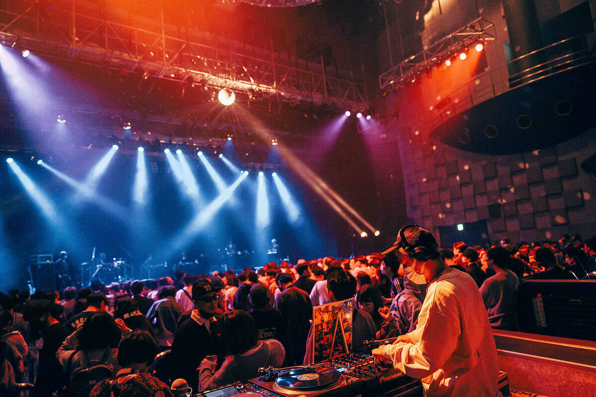 定刻を少し過ぎて開場すると、めいめいグッズやタオルを身に纏ったオーディエンスが、前方からフロアを埋めていった。1Fフロア後方に設けられたDJブースでは、オープニングDJとして大阪堀江のレコードショップ・FLAKE RECORDSのDAWAがヒップホップやR&B中心の選曲で、チルからグルーヴィに会場の雰囲気をじわじわと高めていく。