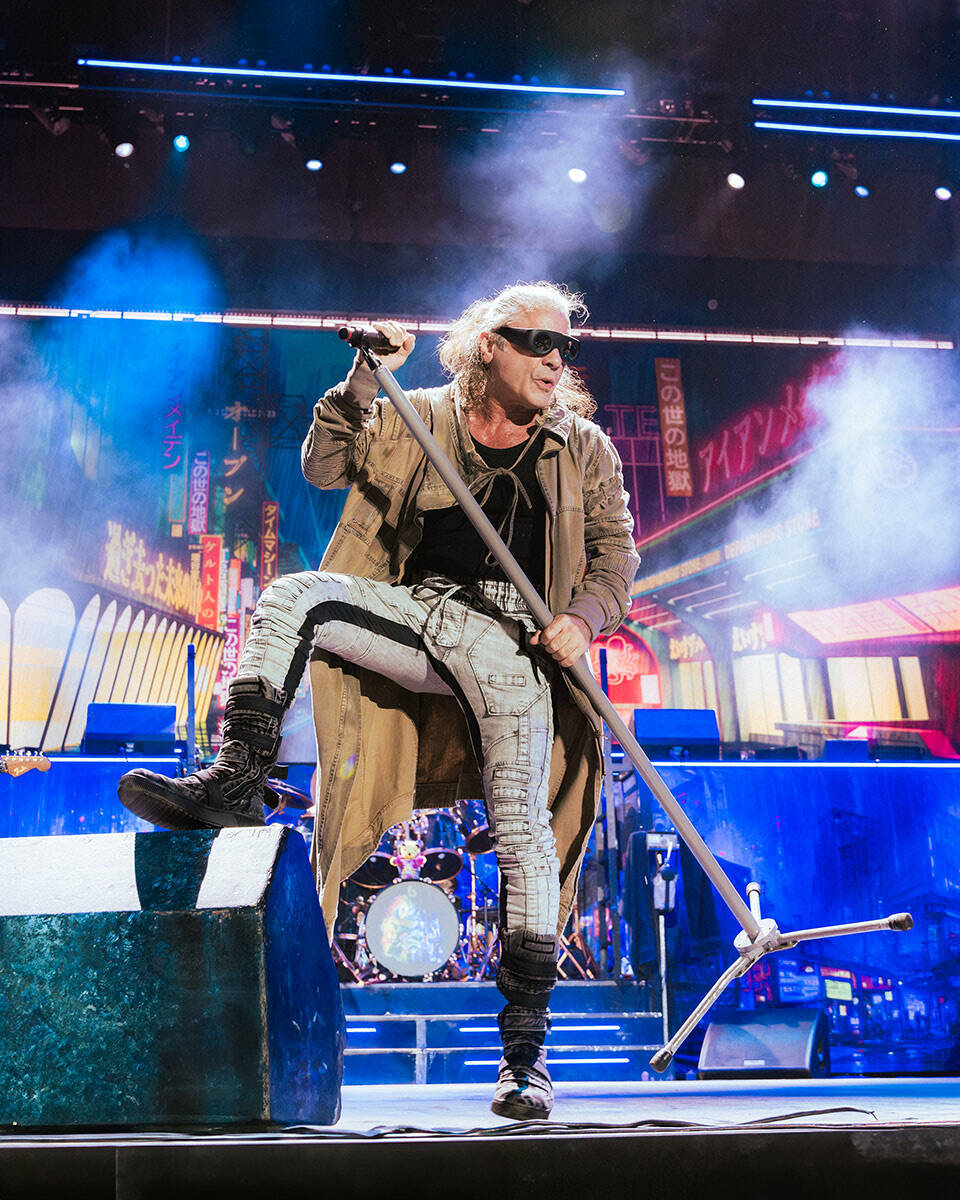 普段なら考えられない6時半という早い時間にトップバッターとして現れたのはアイアン・メイデン。1ステージを2バンドで使うということで、当然ながら彼らであってもその後に控えるガンズ・アンド・ローゼズのベースとなるセットが土台にある上に設置されているので、映像含め演出が普段のメイデンのステージよりも簡易的。セットリストはこのイベントのために特別に組まれたものは一切なく、2023年のFuture Pastワールドツアーと同じセット、つまり、アンコール含めた全15曲中5曲を最新アルバム『Senjutsu』(2021年)からという、レジェンドながら常にアップデートされているバンドというステイトメントだと受け取った。最高気温37度を超えたこの日、ライブの最中もまだ30度をくだらない暑さに観客の我々ですらぐったりとしている中、御年65歳のブルース・ディッキンソンが厚手のコートやレイヤーを重ねた衣装で軽やかにステージの隅々や後方の壇上まで駆け上がり、見事な歌唱を披露する姿はもはや超人にすら見えた。そんなブルースが「メイデンファンは人種やその他のことを気にしないと思っている。私たちは家族であり、皆仲良くしている」と語り、この日の公演は彼らと同世代からその孫世代というジェネレーションにとどまらず、世界中から足を運んだファンの気持ちを一つに繋ぐ実に心温かなものだった。