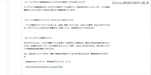 「不正アクセス後 会員制度及びメールマガジンサービス終了「国際平和拠点ひろしま」」の画像1 「不正アクセス後 会員制度及びメールマガジンサービス終了「国際平和拠点ひろしま」」の画像2 「不正アクセス後 会員制度及びメールマガジンサービス終了「国際平和拠点ひろしま」」の画像3 「不正アクセス後 会員制度及びメールマガジンサービス終了「国際平和拠点ひろしま」」の画像4