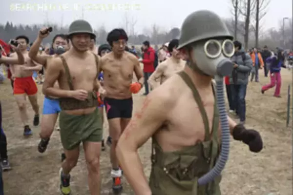 今年で3回目を迎えた「下着マラソン」は現地時間23日午前8時に北京市の五輪公園でスタート。全長3.5キロメートルのコースを約100人のマラソン愛好者たちが下着姿で走った。なかには、ボディペインティングでヒョウに扮して参加するなどのパフォーマンスを見せる人もいた。