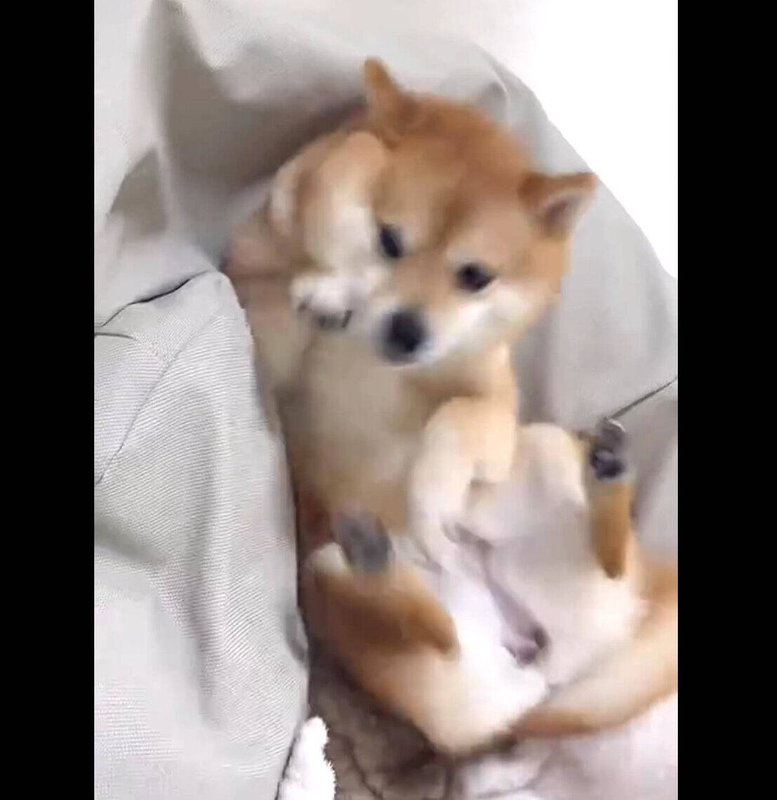 クッションに仰向けの状態で乗っている、柴犬ののん。なんとこの体勢のまま、黒柴のあさと遊ぼうとしているみたい。