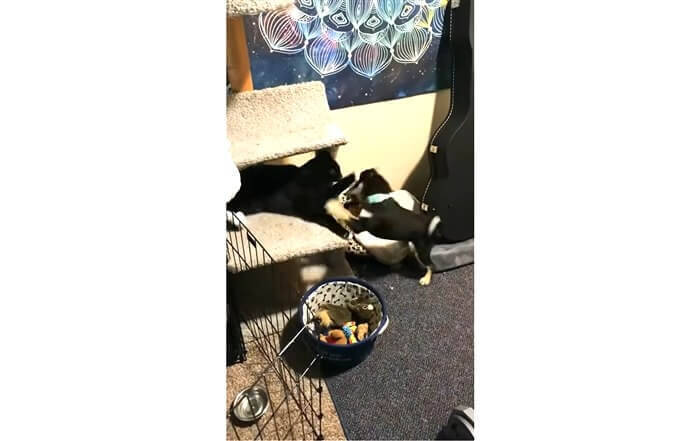 先ほどの動画では、無邪気なパピーとそれに我慢して付き合う先輩猫という構図に見えたふたり。