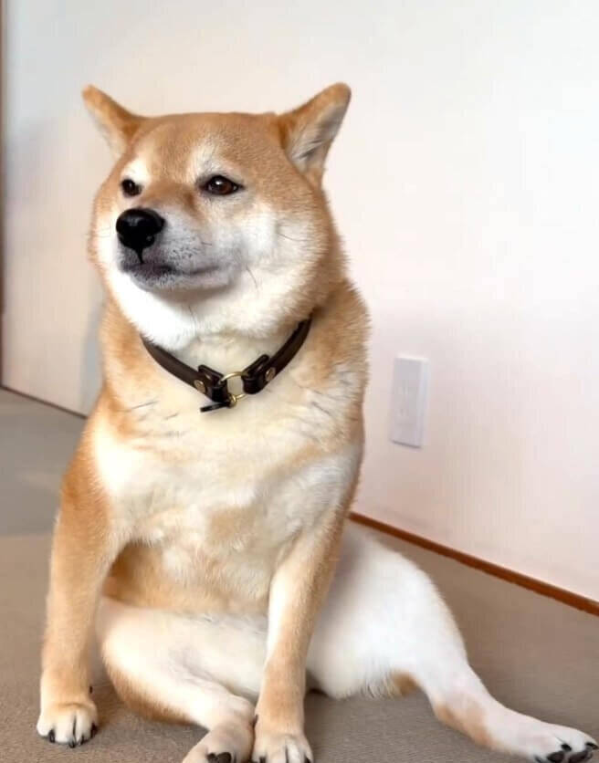 お座りをしている、柴犬のまる。その姿からは犬っぽさがなくなり、もはや人間そのもの。