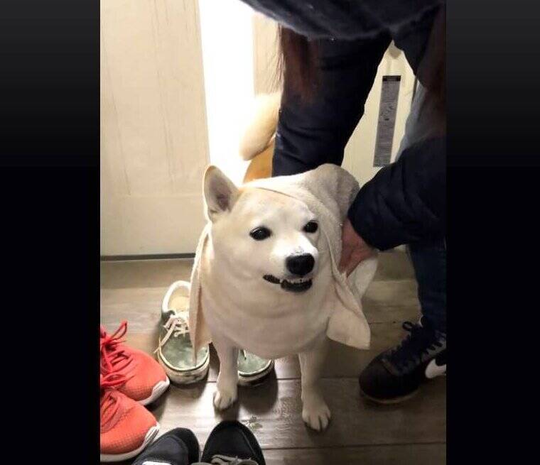 柴犬のゆずは雨降りお散歩から帰宅しました。オーナーさんが濡れた体を拭いてくれています。