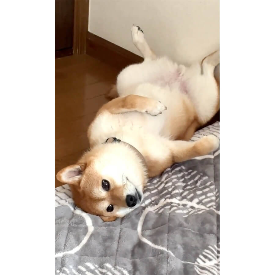 床にひっくり返っている、柴犬のつむぎ。一点をぼんやりと見つめています。