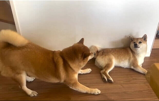 柴犬のうまるは、テンションが上がり気味。プレイバウの体勢で、きょうだい柴のもぐを遊びに誘っています。