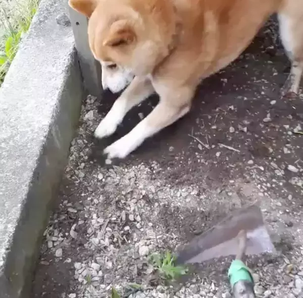 草剃りをしているオーナーさん。その横で、柴犬やまとちゃんもホリホリをしています。