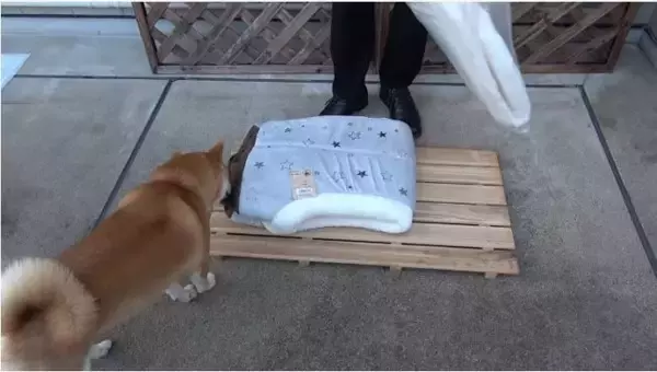いよいよベッドの準備も整い、柴犬がなかに入ってくれるかどうか試してみることに…したらしいのですが…。