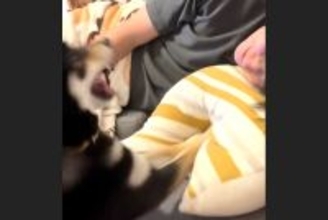 弟くんの上にはクッションが乗っているので、自然と柴犬の位置も高くなります。