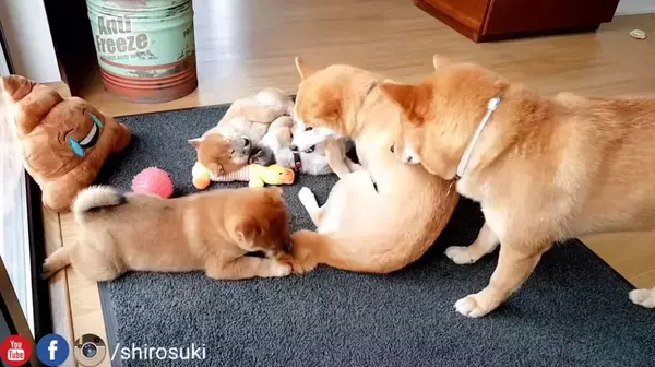 「しっぽで遊ぶパピーとブチギレ寸前のママ、ソワソワ見守るパパにのんきに眠る兄弟まで。柴犬一家、みんな可愛い。【動画】」の画像