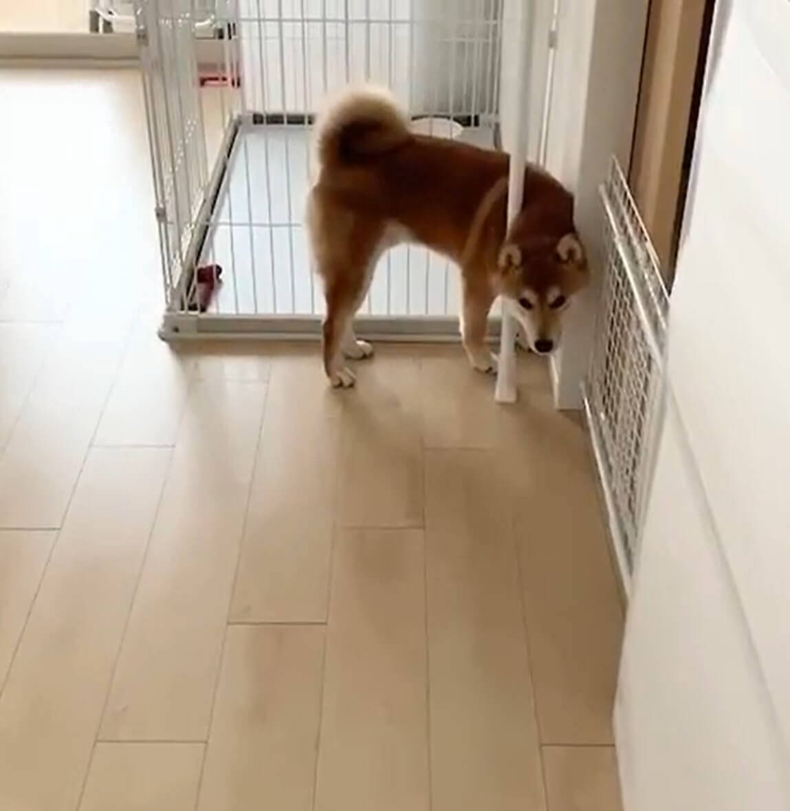 オーナーさんが目を覚ましたらこんな光景が。柴犬波平がケージの隙間にマズルを挟むように、ニョキッと突き出していたのです。