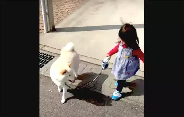なんと、リードを持ってもらっている赤ちゃんの歩幅に合わせ、ミルクが先導し始めたのです。