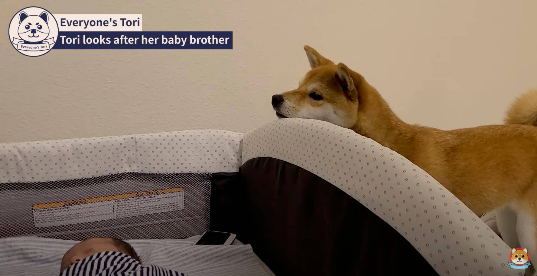 柴犬のToriは、生まれたばかりの赤ちゃんが気になって仕方がないよう。