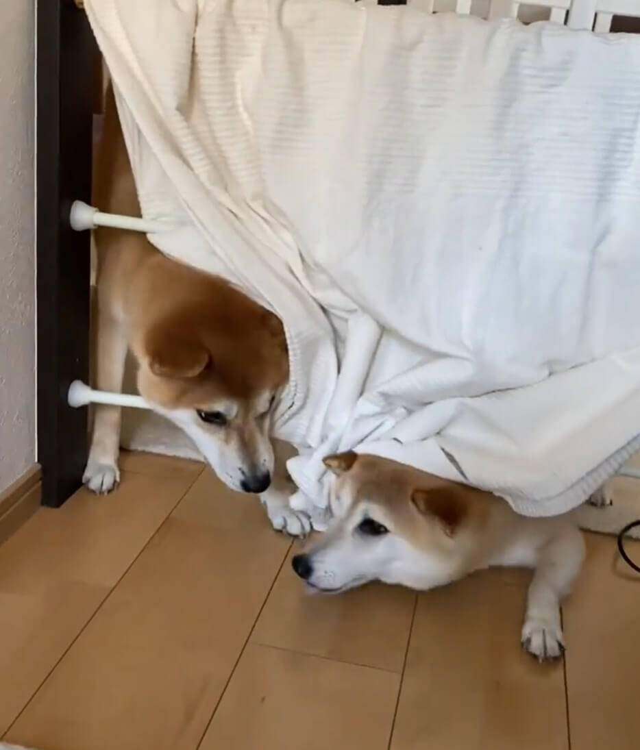 【ちょっと待て】可愛いワンコと狭い隙間でミッチミチになった柴犬。この状況なに…!