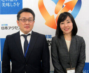 須賀正充課長㊧と二村理美氏(日本アクセス) デリカ商品開発部デリカ商品開発課の二村理美氏は、「『MALdeMEAT』シリーズの家庭用製品では、大豆ミートはもちろんタレもすべて植物性由来の原料で仕上げている。