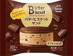 「バタービスケットサンド ダブルショコラ」(税込238円) 「バタービスケットサンド」からは、ココア味の生地にチョコチップを混ぜ込んだショコラクリームで食感にアクセントを付けた「バタービスケットサンド ダブルショコラ」(税込238円)を8日に新発売する。