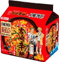 袋麺「チャルメラ しょうゆラーメン 5食パック」「同 宮崎辛麺 5食パック」「同バリカタ麺豚骨 5食パック」、「チャルメラカップ しょうゆ」「同 宮崎辛麺」など主要商品を対象に、期間限定でワンピースデザインパッケージを展開するもの。