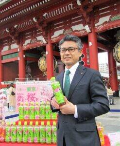 19日、浅草寺で取材に応じた伊藤園の安田哲也緑茶ブランドマネジャー 世界のティーカンパニーを目指し、桜パッケージは23日、上海・台湾・韓国でも同時に発売開始される。