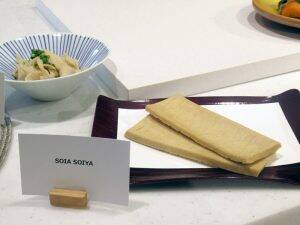 例えば、カットして煮れば高野豆腐のように和食メニューに使えるほか、スティック状にして油で揚げれば、外はカリッと中はしっとりとした食感が楽しめ、スナックやかりんとうのようなお菓子、デザートにも使える。キューブ状にカットして加熱すればサラダのトッピングに、パスタやラーメンといった麺メニューなどに「形×味つけ×アイデア」で用途は無限に広がるという。