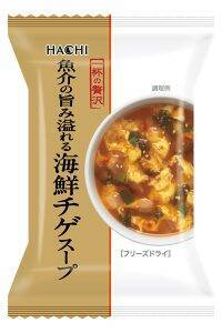 「一杯の贅沢海鮮チゲスープ」「一杯の贅沢 魚介の旨み溢れる海鮮チゲスープ」はお湯を注ぐだけで簡単に楽しめるフリーズドライのスープ。魚介のうまみを利かせたスープで、ほたて、大根、ねぎなどの具材と国産たまごで風味豊かに仕上げた。8.0g。「スンドゥブの素」は手軽に韓国気分を味わえる新商品。アサリ、エビ、カニの3種の魚介のうまみがたっぷり溶け込み、粗挽き唐辛子の程よい辛味が効いたスンドゥブの素に仕上げた。