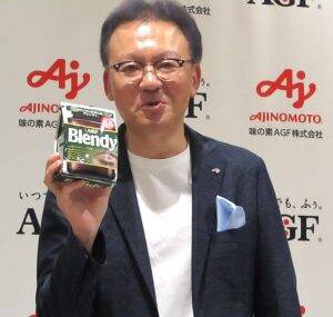 「ブレンディ」インスタントコーヒーをアピールする島本社長 これについて、伊藤英郎コンシューマービジネス部長は「原料の高騰が止まらず、価格転嫁せざるを得ない状況でも、生活者の方が少しでも手に取りやすい価格を実現すべくサイズを拡充した」と説明する。