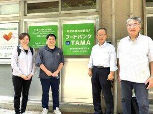 フードバンクTAMA入り口で特定非営利活動法人フードバンクTAMA理事事務局長の芝田晴一朗さん(中央右)、手嶋さん(左)、中前さん(中央左)、渡邊さん(右) 7月22日、「フードバンクTAMA」(東京都日野市)と「日野市社会福祉協議会」(同)を基点に、「デイケアルームフローラ」(NPO法人ゆめのめ運営)と「放課後等デイサービス クリッパーズ」(NPO法人ひの・I-BASYOクリッパーズ運営)での支援活動に参加したのは、ファンマーケティング推進部コーポレートコミュニケーショングループの手嶋めいさんと東京支社の中前郁也さんの二人。