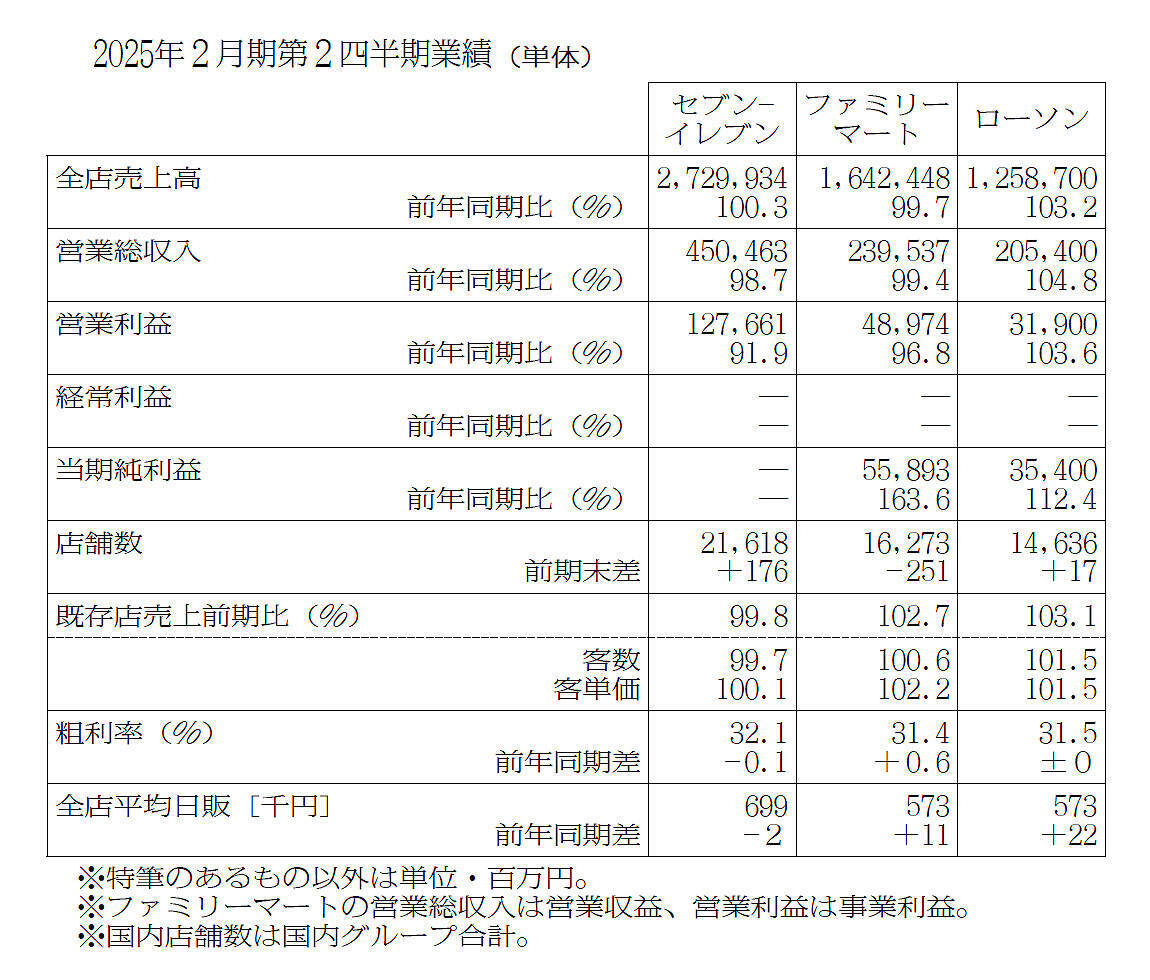 既存店売上高は、ファミリーマートとローソンが前年超えで客数・客単価ともに上回った。セブン-イレブン・ジャパンはわずかに及ばず、客数減が最大の課題となった。