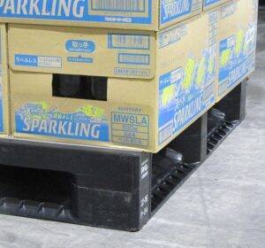 効率的な輸送に欠かせないパレット(荷台)。飲料の出荷は、ケースをパレットに積み上げ(パレタイズ)、そのパレットをフォークリフトでトラックに積み込んで行われる。