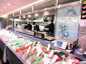 対面売場では、来店客とのコミュニケーションや魚文化の伝承を図るべく、調理場との間のガラス板を取り払い、ライブ感を演出。三枚卸しや塩焼き用など来店客の要望に合わせた加工調理に応じている。