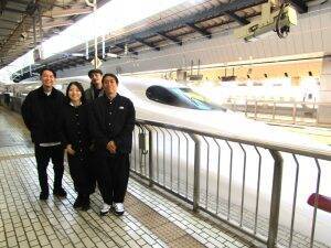 会場となった「のぞみ343号」普通車16号車の前に立つ赤塚由記さん(中央左)、石谷貴之さん(左)、小坂田祐哉さん(中央右)、西尾逸平さん(右) 企画したのは赤塚由記さん。東海鉄道事業本部施設部管理課に所属し、普段は名古屋で在来線の人事を担当している。