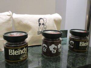 COFFEE BOYさんオリジナルデザインバックとCOFFEE BOYさんイラスト入り「ブレンディ」インスタントコーヒー瓶80g イベントでは、「ブレンディ」または「ちょっと贅沢な珈琲店」のインスタントコーヒーを使用したブラックコーヒーやカフェオレの飲み比べを実施。豆乳やアーモンドミルクで作ったカフェオレも取りそろえる。